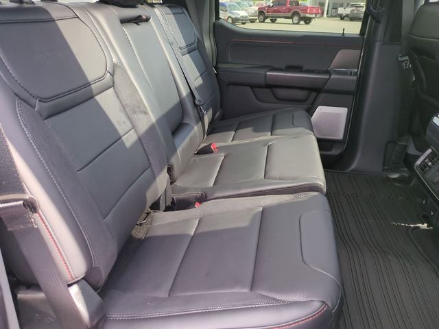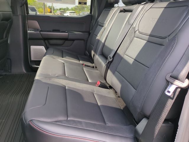 This F-150 Raptor is nicely equipped with Equipment Group 801A Standard (17 Cast Aluminum Wheels, Electronic Locking with 4.10 Axle Ratio, Leather Trimmed Seats, Radio: B&O Unleashed Sound System by Bang & Olufsen, and SYNC 4 with Enhanced Voice Recognition), Ford Connectivity Package (1-Year Included), Ford Connectivity Package (one-Time Purchase - 7 Years), Internet access capable: 5G Modem - Ford Connectivity Package, 4WD, 14 Speakers, 4-Wheel Disc Brakes, ABS brakes, Adjustable pedals, Air Conditioning, Alloy wheels, AM/FM radio: SiriusXM with 360L, Auto High-beam Headlights, Auto tilt-away steering wheel, Auto-dimming door mirrors, Auto-dimming Rear-View mirror, Automatic temperature control, Brake assist, Bumpers: body-color, Compass, Delay-off headlights, Driver door bin, Driver vanity mirror, Driver's Side SecuriCode Keyless-Entry Keypad, Dual front impact airbags, Dual front side impact airbags, Electronic Stability Control, Emergency communication system: SYNC 4 911 Assist, Front anti-roll bar, Front Bucket Seats, Front Center Armrest, Front dual zone A/C, Front fog lights, Front License Plate Bracket, Front reading lights, Front wheel independent suspension, Fully automatic headlights, Garage door transmitter, Heated door mirrors, Heated front seats, Heated rear seats, Heated steering wheel, Illuminated entry, Lane Departure Warning System, Leather steering wheel, Low tire pressure warning, Memory seat, Navigation system: Connected Navigation, Occupant sensing airbag, Outside temperature display, Overhead airbag, Overhead console, Panic alarm, Passenger door bin, Passenger vanity mirror, Pedal memory, Power door mirrors, Power driver seat, Power passenger seat, Power steering, Power windows, Radio data system, Rain sensing wipers, Rear reading lights, Rear step bumper, Rear window defroster, Remote keyless entry, Security system, Speed control, Speed-sensing steering, Split folding rear seat, Steering wheel memory, Steering wheel mounted audio controls, Tachometer, Telescoping steering wheel, Tilt steering wheel, Tough Bed Spray-in Bedliner, Traction control, Trip computer, Turn signal indicator mirrors, Twin Panel Moonroof, Variably intermittent wipers, and Ventilated front seats.